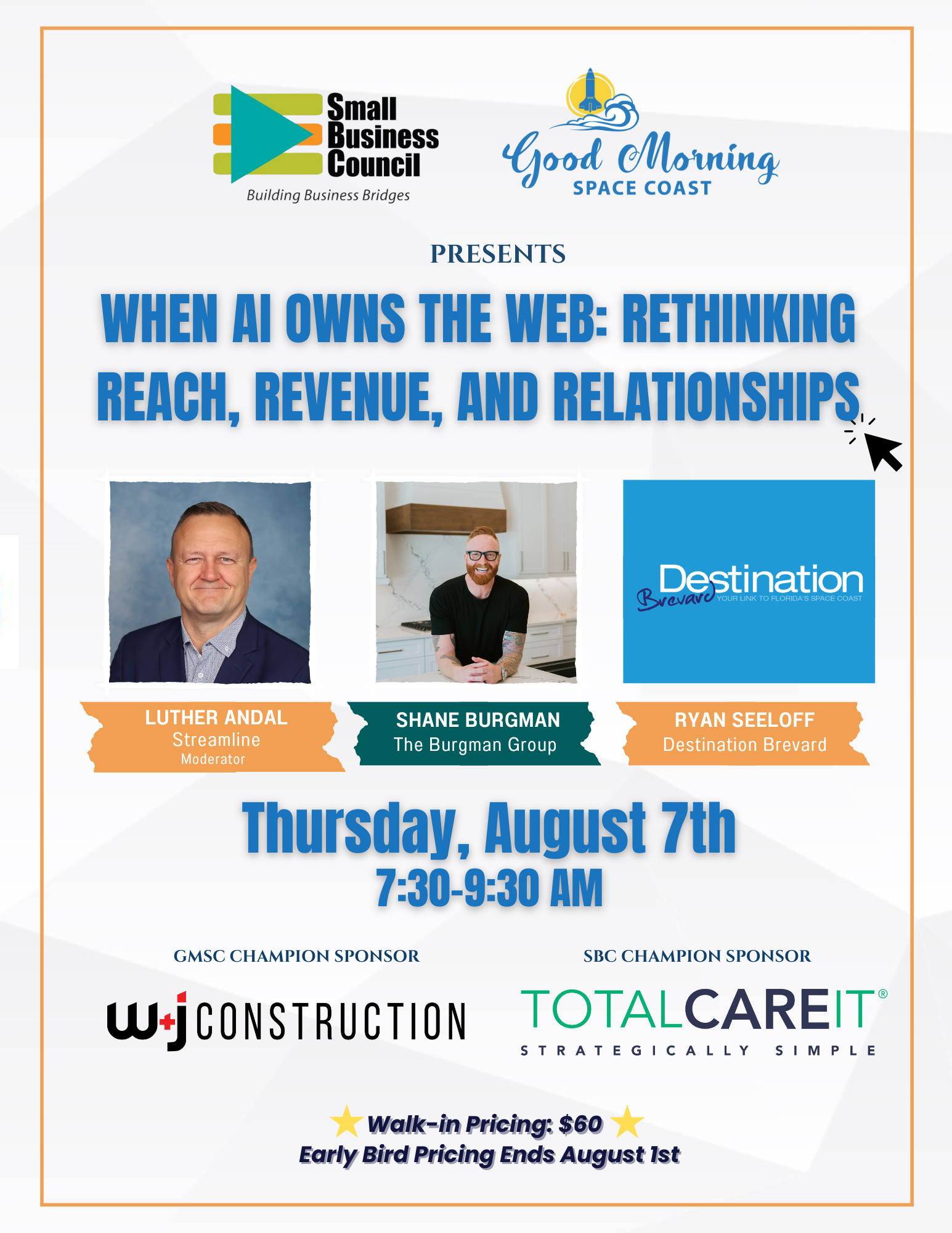 The rise of AI is rewriting the rules of online marketing. For small businesses, this means the traffic and leads you’ve relied on are disappearing fast. Join the Small Business Council and Good Morning Space Coast for "When AI Owns the Web: Rethinking Reach, Revenue, and Relationships" — a must-attend event where you’ll learn how to reclaim your audience and build stronger connections using fresh content strategies like video, podcasts and social media.