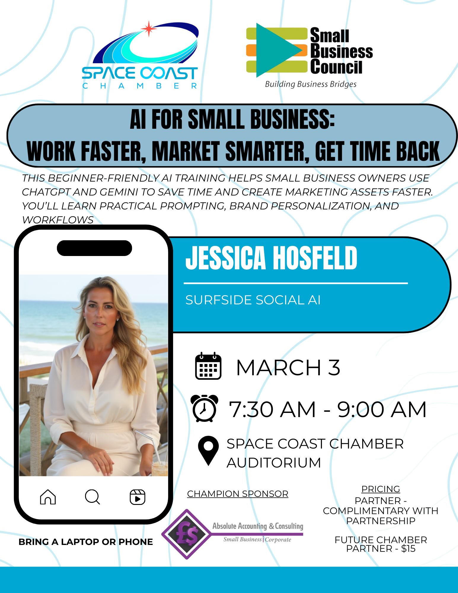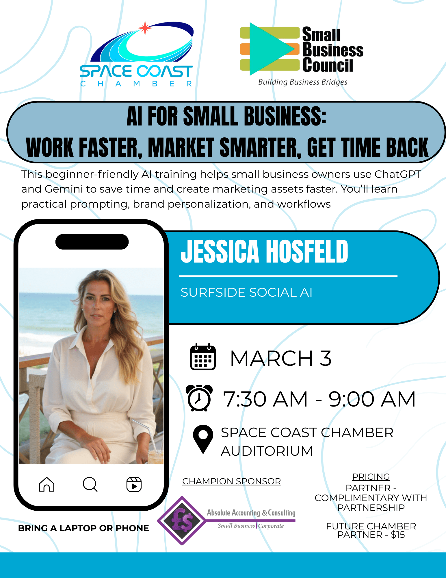 This beginner-friendly, hands-on AI training is built for real small business owners, not “tech people.” In 90 minutes, you’ll learn how to use tools like ChatGPT and Gemini to save hours each week, create marketing assets faster, and make better decisions with less effort. We’ll cover prompting that sounds human, personalization to your brand voice, simple safety best practices, and practical workflows for research, planning, and content creation. Bring a laptop (preferred) or phone and leave with ready-to-use assets you can apply immediately.