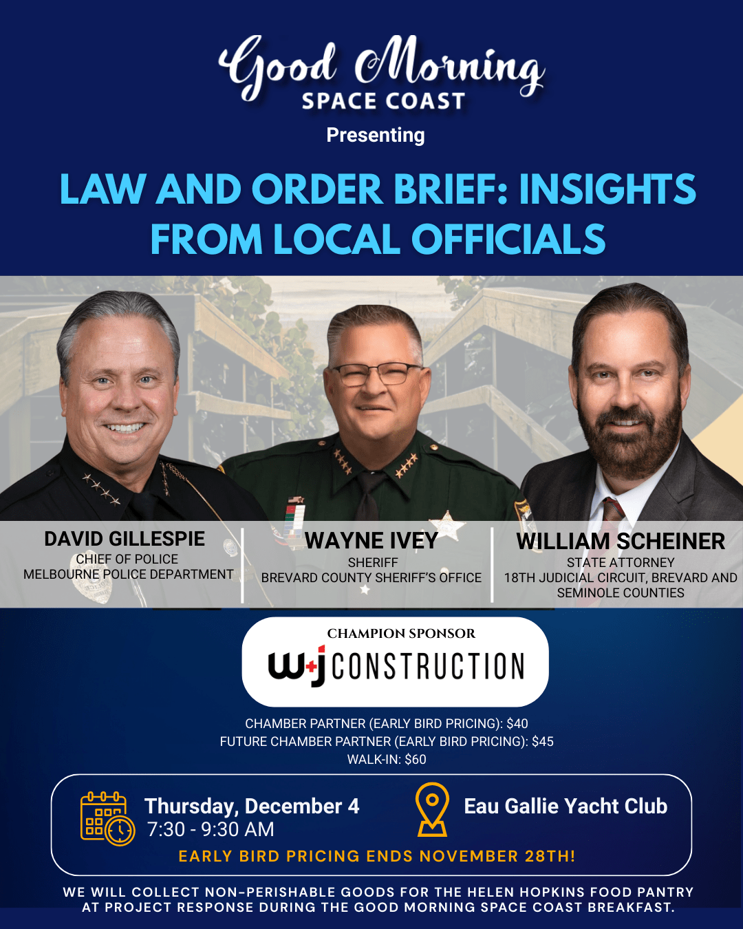 Kick off your day informed and empowered! Join local officials for an exclusive briefing on the latest law enforcement updates, community safety initiatives, and key insights that impact the Space Coast. This is your chance to hear directly from the people keeping our neighborhoods safe—and to get answers to the questions that matter most.