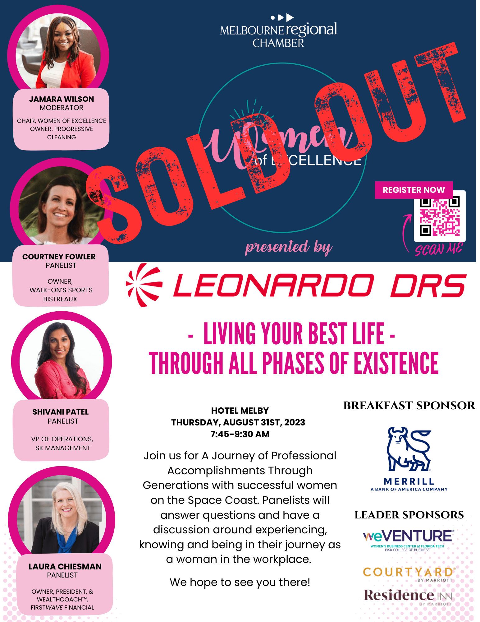 Join us for A Journey of Professional Accomplishments Through Generations with successful women on the Space Coast. Panelists will answer questions and have a discussion around experiencing, knowing and then being in their journey as a woman in the workplace. This event will take place over breakfast at The Hotel Melby on Thursday, August 31st, 2023, 7:45am-9:30am. We hope to see you there!