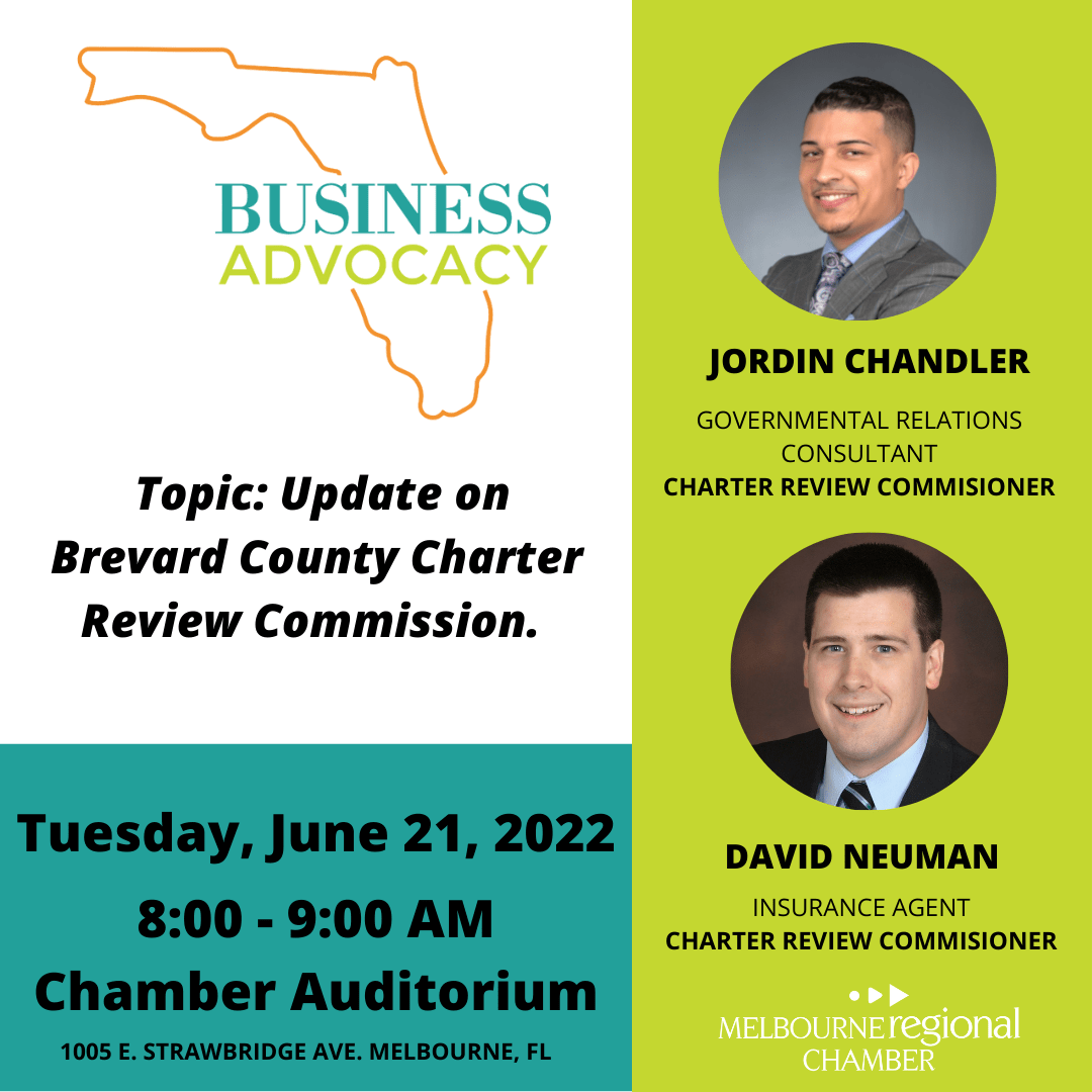 Did you know the Charter Review Commission meets every six years to discuss proposals to change the county charter. The 2021-2022 Commission has been discussing several proposals to put on the ballot. Come hear updates on what changes may be proposed. Guest speakers include Commission members Dave Neuman and Jordin Chandler.