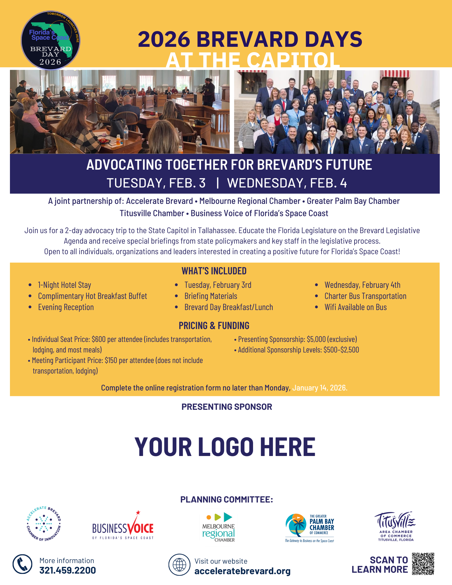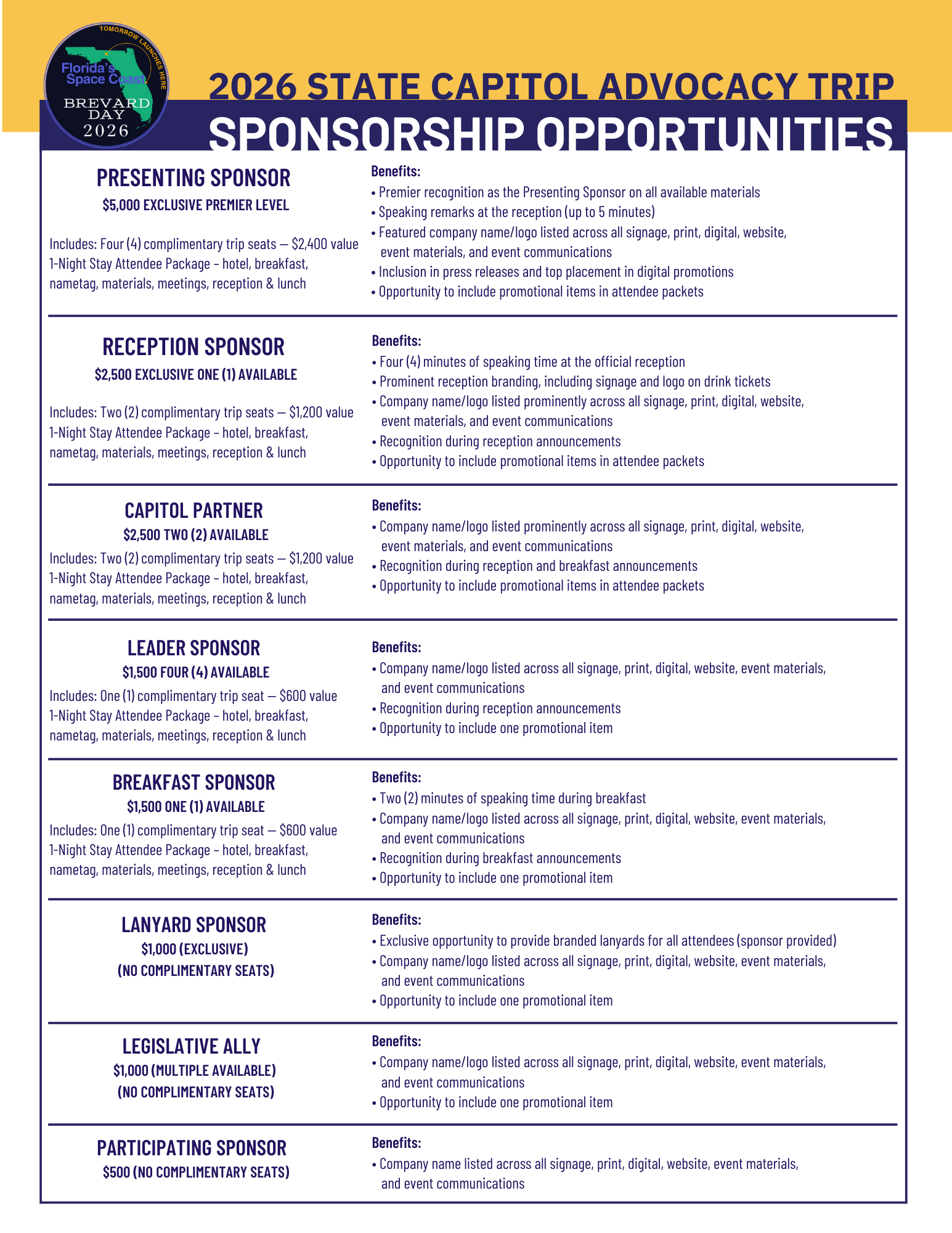 Join us for a 2-day advocacy trip to the State Capitol in Tallahassee. Educate the Florida Legislature on the Brevard Legislative agenda and receive special briefings from state policymakers and key staff in the legislative process. Open to all individuals, organizations and leaders interested in creating a positive future for Florida's Space Coast!