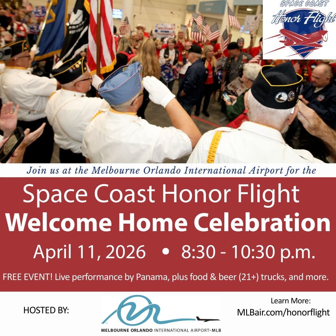 SCC Team Back to Search Space Coast Honor Flight Welcome Home Celebration Saturday, April 11, 2026 (8:30 PM - 10:30 PM) (EDT) Description FREE EVENT! Live performance by Panama, plus food & beer (21+) trucks, and more. Additional Info × Melbourne Orlando International Airport One Air Terminal Parkway, Ste 220 Melbourne, FL 32901 United States Saturday, April 11, 2026 (8:30 PM - 10:30 PM) (EDT) Registered Guests × Share × Print Email Add to Calendar Facebook LinkedIn X Pinterest Powered By GrowthZone