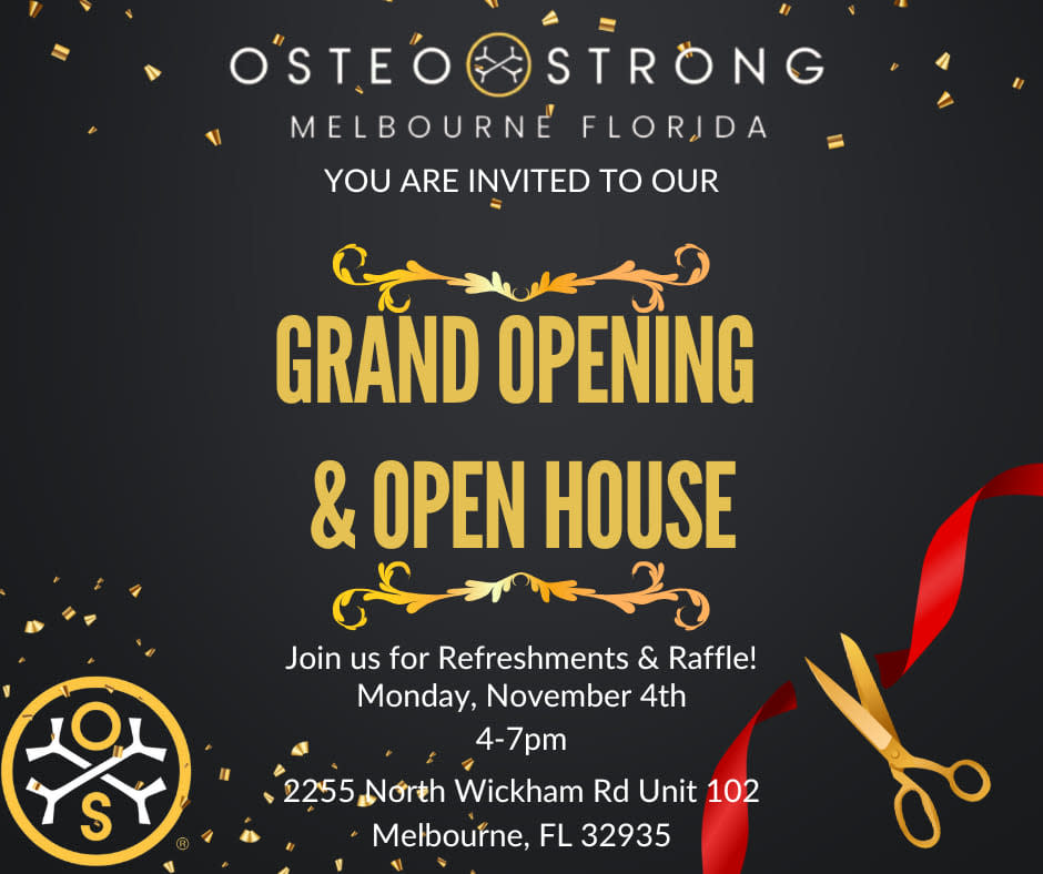 Please join us on Monday, November 4th, 4:00 - 7:00 PM for the Grand Opening and Ribbon Cutting of OsteoStrong Melbourne! Tours will be available with light refreshments and drinks. Meet our owners and coaches, who will be available to answer your questions.