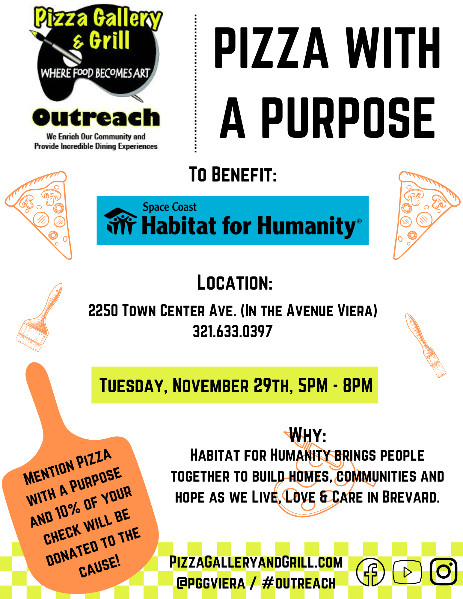 Join us Tuesday, November 29th from 5PM to 8PM for Pizza with a Purpose at The Pizza Gallery & Grill in The Avenue Viera for an evening of dining with family and friends! Make sure to mention Pizza with a Purpose and 10% of your bill will be donated to Space Coast Habitat for Humanity. Habitat for Humanity brings people together to build homes, communities and hope as we Live, Love & Care in Brevard.