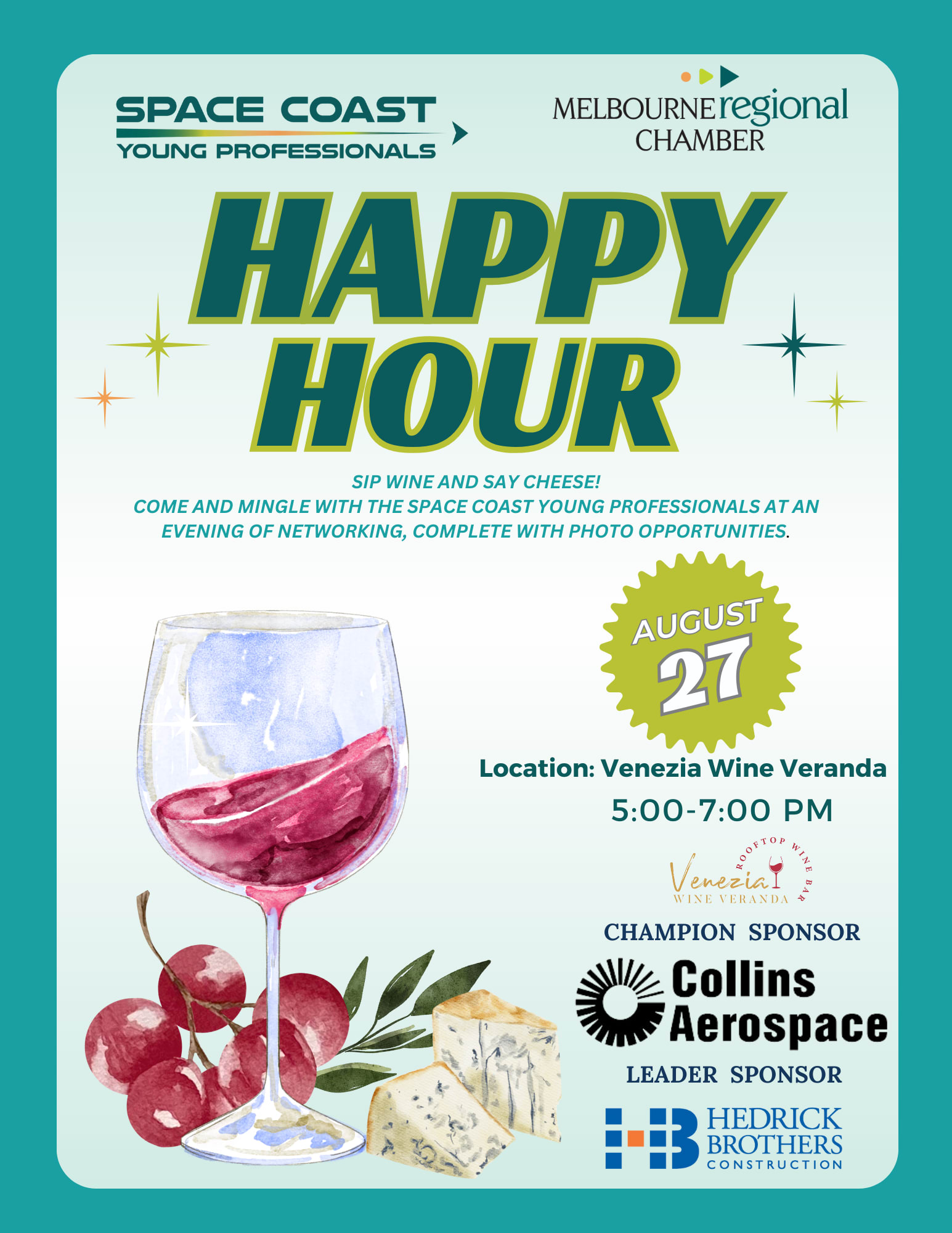 Join us for the Space Coast Young Professionals Happy Hour at Venezia Wine Veranda! Sip wine, say cheese, and enjoy an evening filled with networking opportunities, photo moments, and exciting raffles.