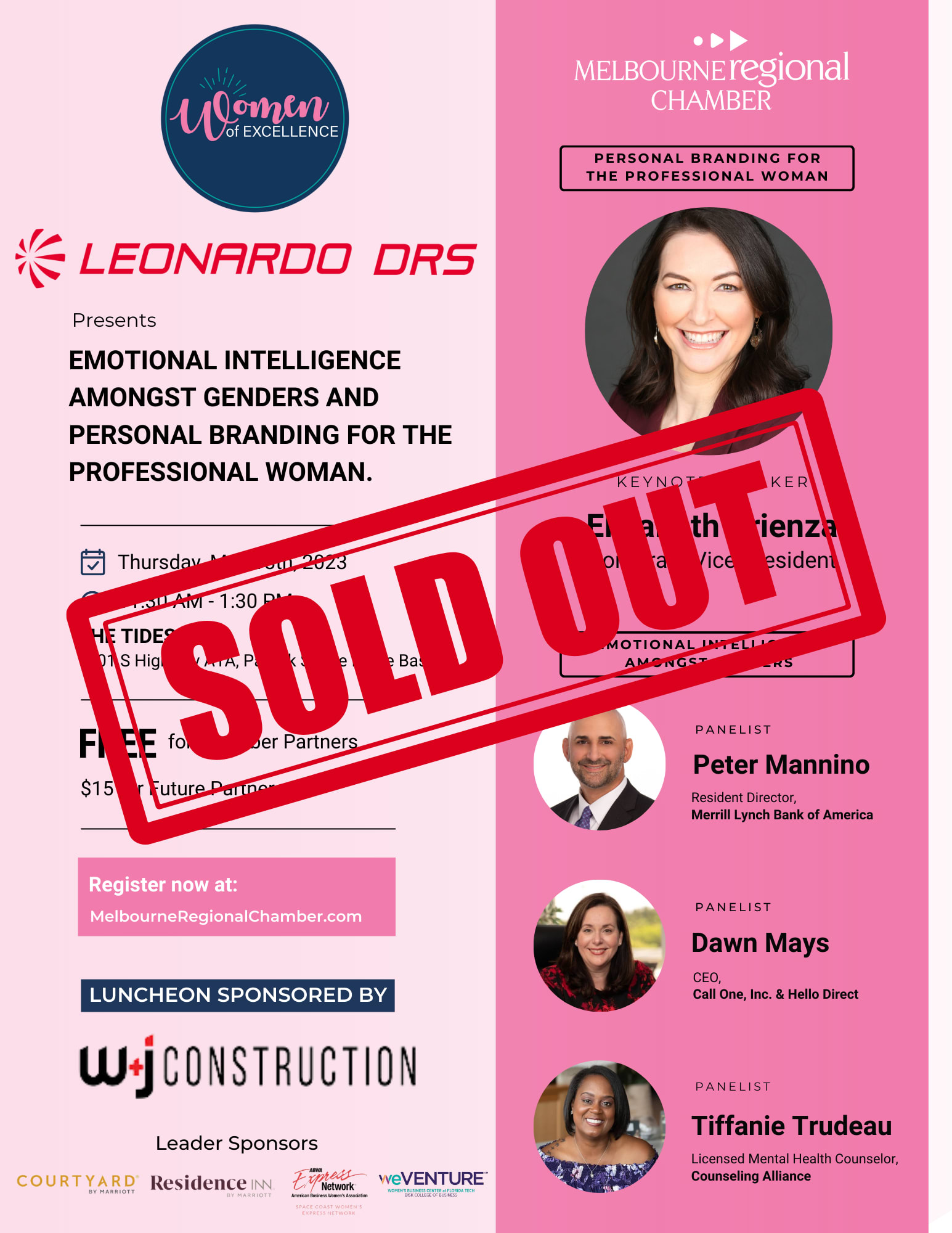 The Melbourne Regional Chamber Women of Excellence's next in person event will take place at The Tides on Thursday May 18th, 2023, 11:30am-1:30pm. The event will be a two part session. We will have a keynote presentation on "Personal Branding for the Professional Woman", the speaker will encourage and inspire women to own their professional presence. Followed by a "Emotional Intelligence Amongst Genders" panel discussion. Speakers on this panel will discuss, in general, components associated with emotional intelligence in the workplace and how those components apply across genders.