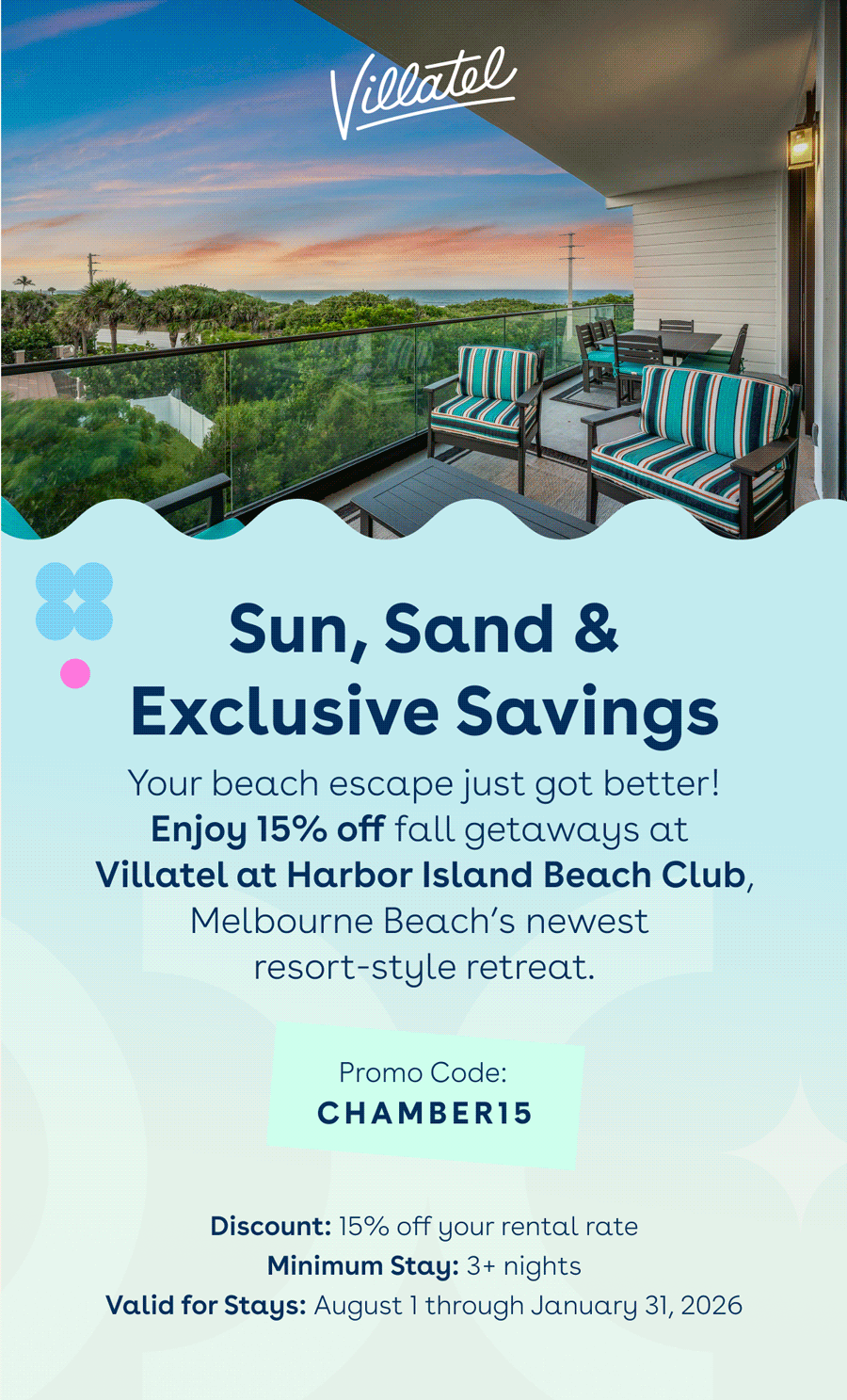We’re excited to offer Melbourne Chamber of Commerce partners 15% off your next stay at Villatel at Harbor Island Beach Club, our luxury beachfront destination in Melbourne Beach. Whether you’re planning a family getaway, staycation, or hosting out-of-town guests—this is your chance to experience resort-style living right on the coast.