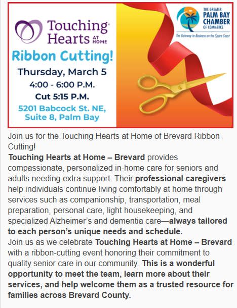 Join us for the Grand Opening of Touching Hearts at Home of Brevard! π We’re excited to welcome the community and officially open our doors as a new home care agency dedicated to compassionate, personalized care right here in Brevard. Come meet our team, learn about our non-medical home care services, and see how we help seniors and adults remain safe and comfortable at home. Enjoy light refreshments, great conversations, and a relaxed, welcoming atmosphere as we celebrate together. π 5201 Babcock St. Suite 8, NE Palm Bay, FL 32905 π